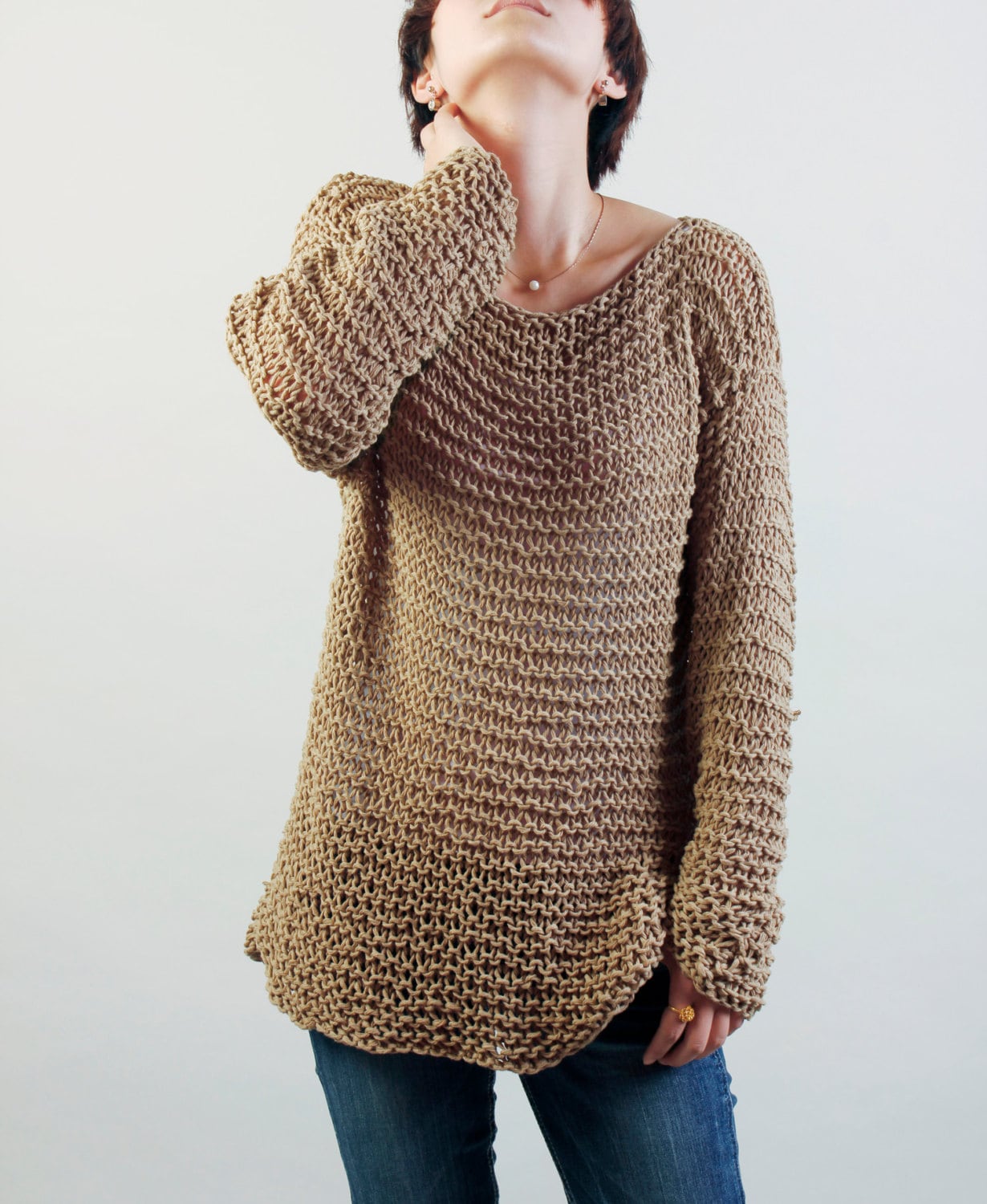 It is used 100% eco cotton yarn in nice wheat shade. The sleeves are extra long (almost to reach your fingers).