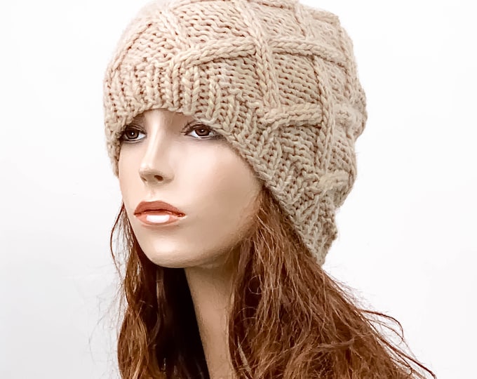 Hand Knit Merino Wool Beret: Wheat Diamond Pattern Beanie